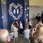 Przy tej okazji odbyło się także rozstrzygnięcie konkursu „Zgadnij, która to pani”. Dzieciom, które wzięły udział w konkursie, pani dyrektor wręczyła dyplomy, nagrody rzeczowe i słodkie upominki. Był to dla nas wszystkich dzień, pełen wrażeń i miłych niespodzianek. Możemy być dumni z naszych przedszkolaków, że już od najmłodszych lat kultywują ważne świąteczne tradycje.